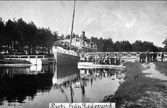 Karlsborg, parti från Rödesund. Båten Ceres passerar rullbron.
