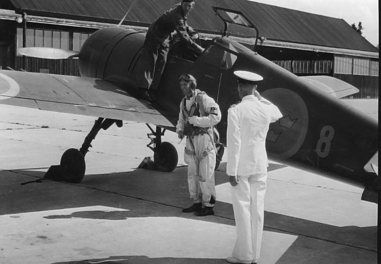 F6 Karlsborg 1945. General Nordenskjöld anländer till F6 för att inviga idrottsplatsen. Välkomnas här av överste Hård. Albumet är en del av en donation från Karl-Axel Hansson, Karlsborg. Förteckning över hela donationen finns i albumet samt som Word-dokument.