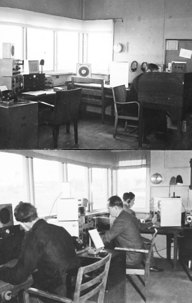 F6 Karlsborg 1945. I mitten radiotelegrafist Erlandsson. Albumet är en del av en donation från Karl-Axel Hansson, Karlsborg. Förteckning över hela donationen finns i albumet samt som Word-dokument.