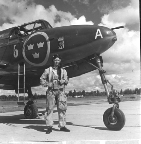 F6 Karlsborg 1951. Löjtnant Nilsson (Ignell) och flygplan A21. Albumet är en del av en donation från Karl-Axel Hansson, Karlsborg. Förteckning över hela donationen finns i albumet samt som Word-dokument.