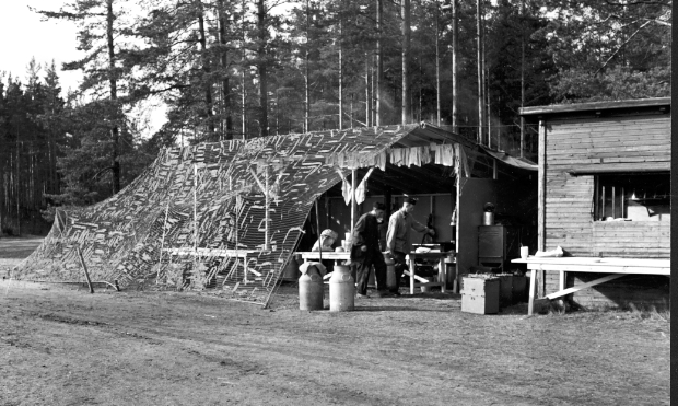 F6 Karlsborg 1952. Eskaderövning i Hultsfred. Förplägnadsinrättningen. Albumet är en del av en donation från Karl-Axel Hansson, Karlsborg. Förteckning över hela donationen finns i albumet samt som Word-dokument.
