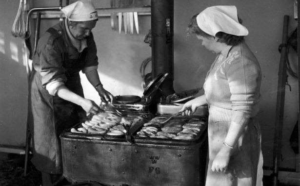 F6 Karlsborg 1952. Eskaderövning i Hultsfred. Förplägnadsinrättningen. Albumet är en del av en donation från Karl-Axel Hansson, Karlsborg. Förteckning över hela donationen finns i albumet samt som Word-dokument.