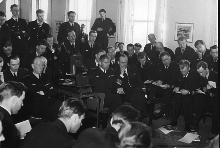 F6 Karlsborg 1953. Flygande personal under en övning i taktiska spel under ledning av CE1 Bjuggren. Albumet är en del av en donation från Karl-Axel Hansson, Karlsborg. Förteckning över hela donationen finns i albumet samt som Word-dokument.