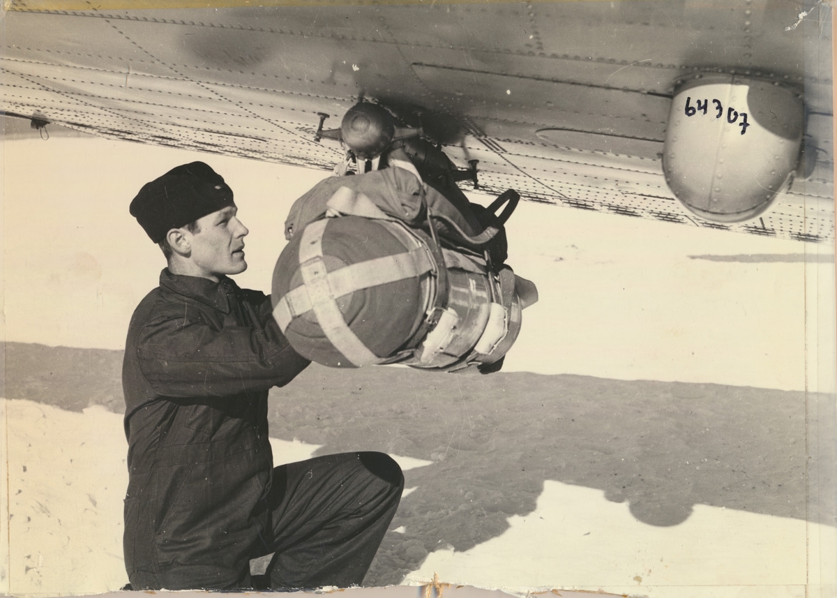 Titel: F6 i Karlsborg. Behållare "matbomber" med fallskärm och upphängningsanordningar. Fälldes i mars 1942 av B5:or ur 2. och 3. divisionen för att förse befolkningen inom insnöade områden i landet med proviant.