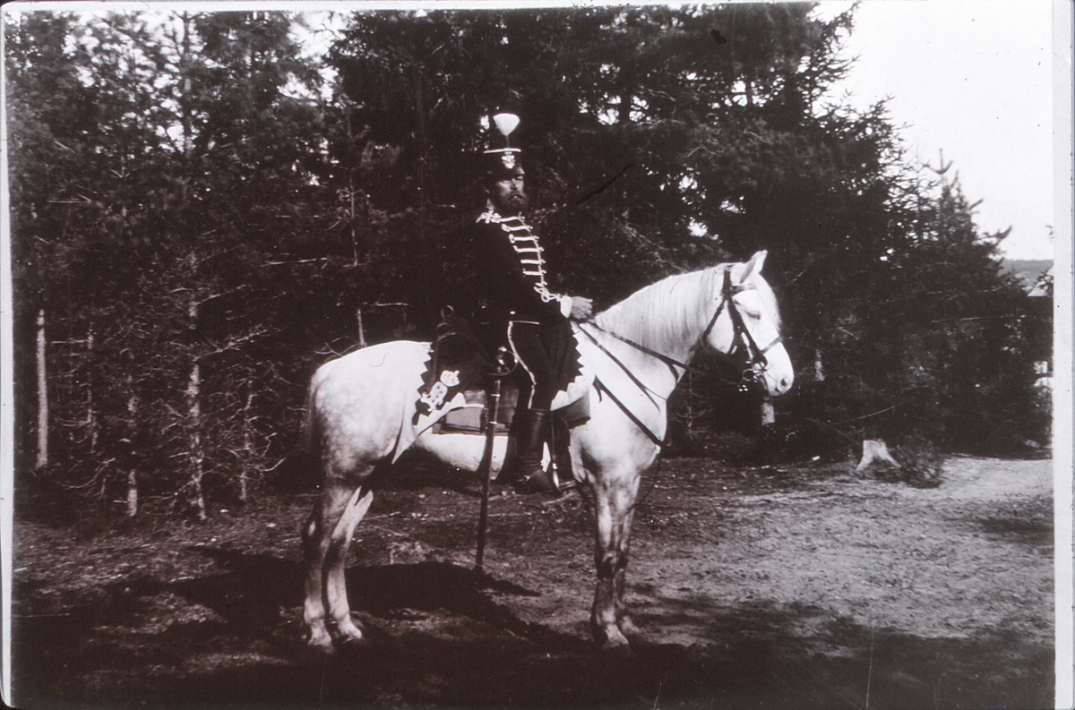 Livregementets husarer. Husarlägret på Sanna hed slutet 1800-tal.Husaren vid västre Nerikes skvadron nr.10 Sjöö, född 1855, kom i tjänst 1875 avsked 1905.Sjöö red för rusthållet nr 10 Järsjö, Kumla socken.