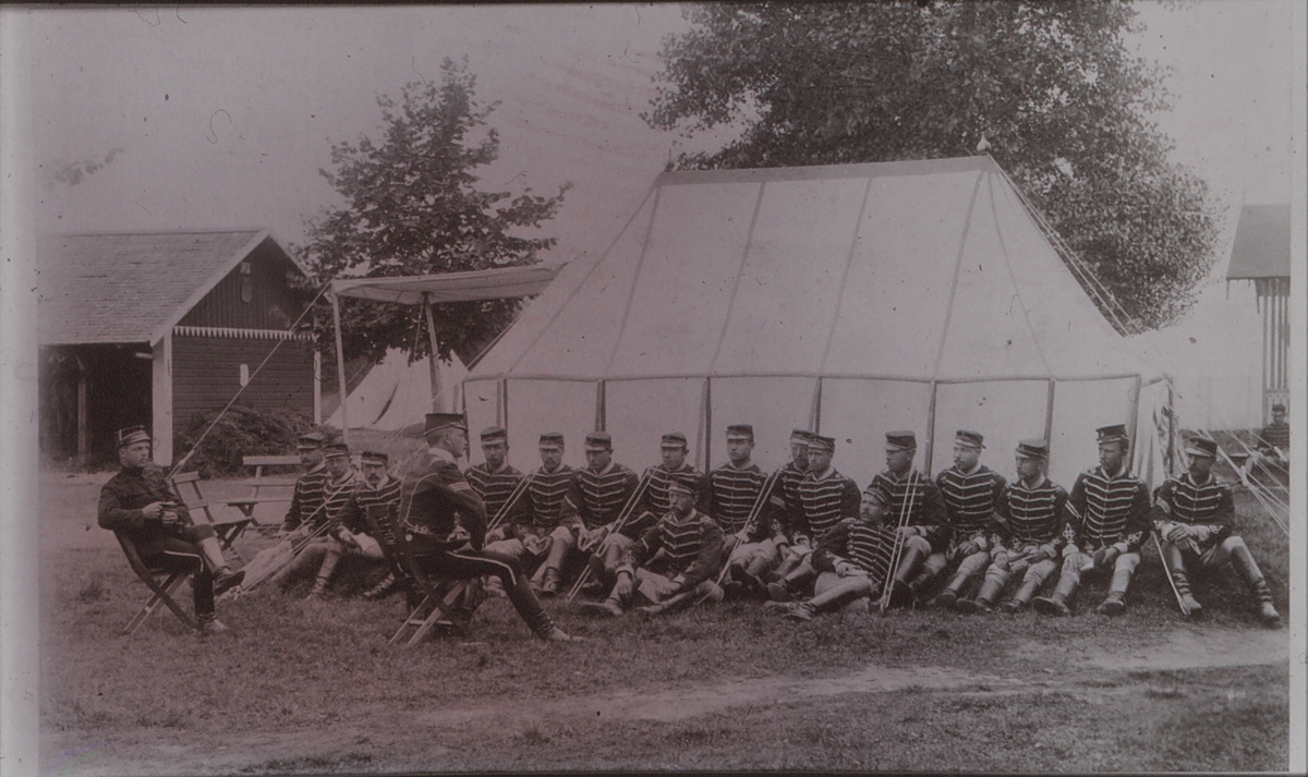 Livregementets husarer. Husarlägret på Sanna hed. Underlöjtnant Gustav von Essen har lektion ur ryttarinstruktionen med indelta husarer ur Vadsbo skvadron. 5 skvadronens stall i bakgrunden.