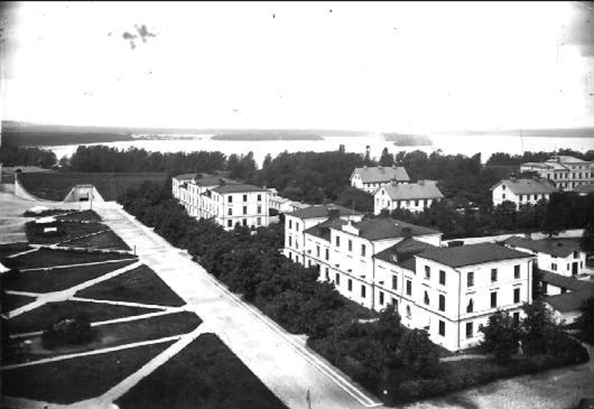 Fästningen. Götiska valvet syns rakt fram, till höger västra och mellersta befälsbyggnaderna (ingenjörkårens etablissement). Tidigt 1900-tal