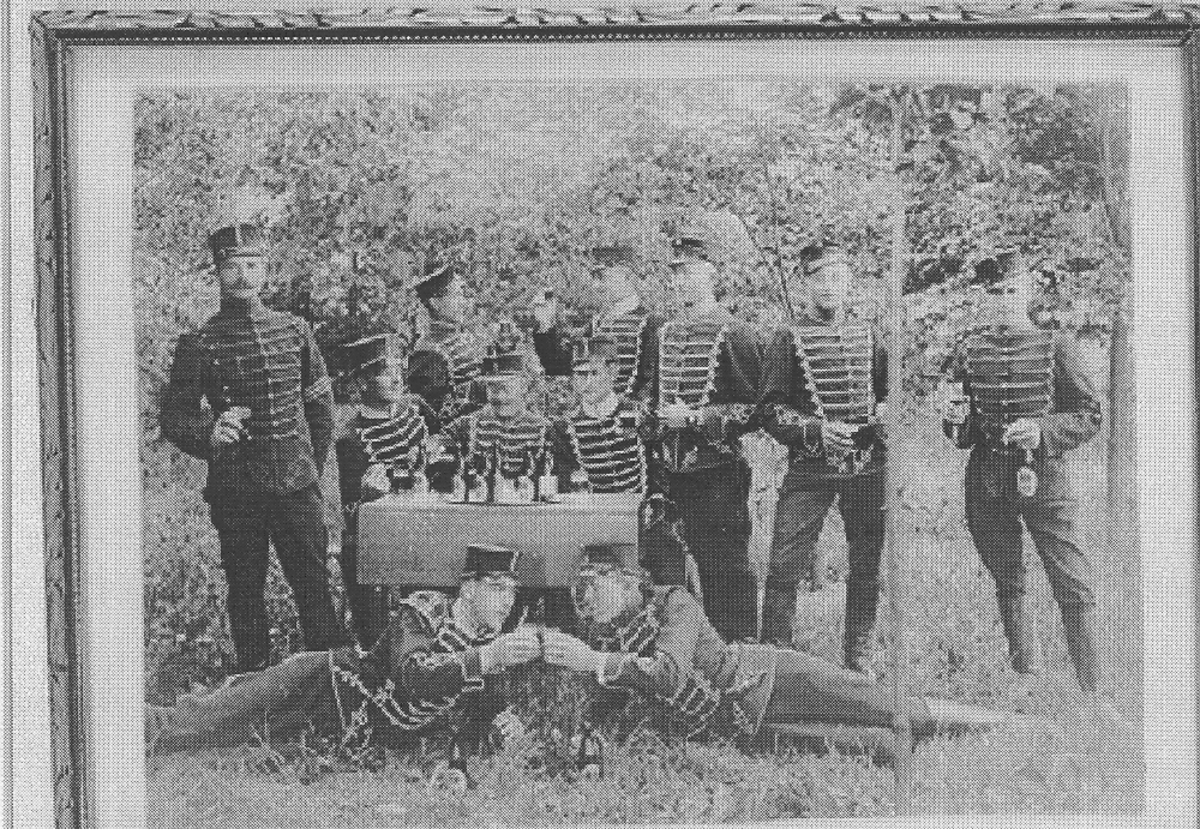 K3. Underofficersskolan i Skövde före år 1914. Stående, liggande och sittande i gröngräset drickande öl.