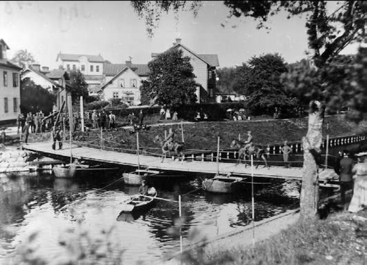 Ing 2, broslagning vid Gullspång omkring 1890..Objektkommentar:Bilden är troligen inte tagen i Gullspång.Avbrottets längd och strandskyddet indikerar att den kan vara tagen någonstans längs Göta kanal, kanske västgötadelen eftersom götaingenjörerna var förlagda i Karlsborg mellan 1875-1928.