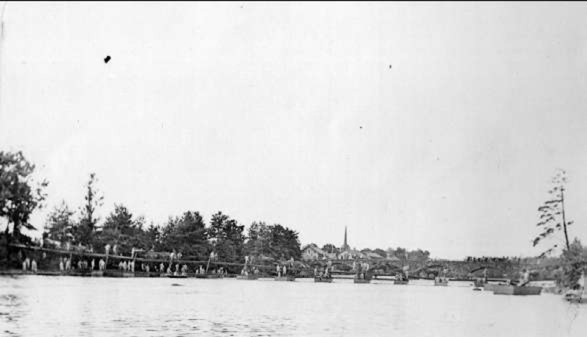 Ing 2, bro med förhöjd brobanavid Åtorp sommaren 1910. Krigsbrokolonnen passerar Letälven. Objektkommentar: Efter kraftverksbygget i Gullspångsälven blev klart 1908 försämrades övningsmöjligheterna i älven vid Göta holme. Förbandet sökte sig därför till andra närbelägna platser, tydligen bl.a. denna.Ingen plats befanns dock vara tillräckligt bra och efter sommarövningarna 1911avvecklades därför övnings- och lägerplatsen Göta holme.(Se tidskrift i Fortifikation årgång 2002 nr 2 sid 38 ff).