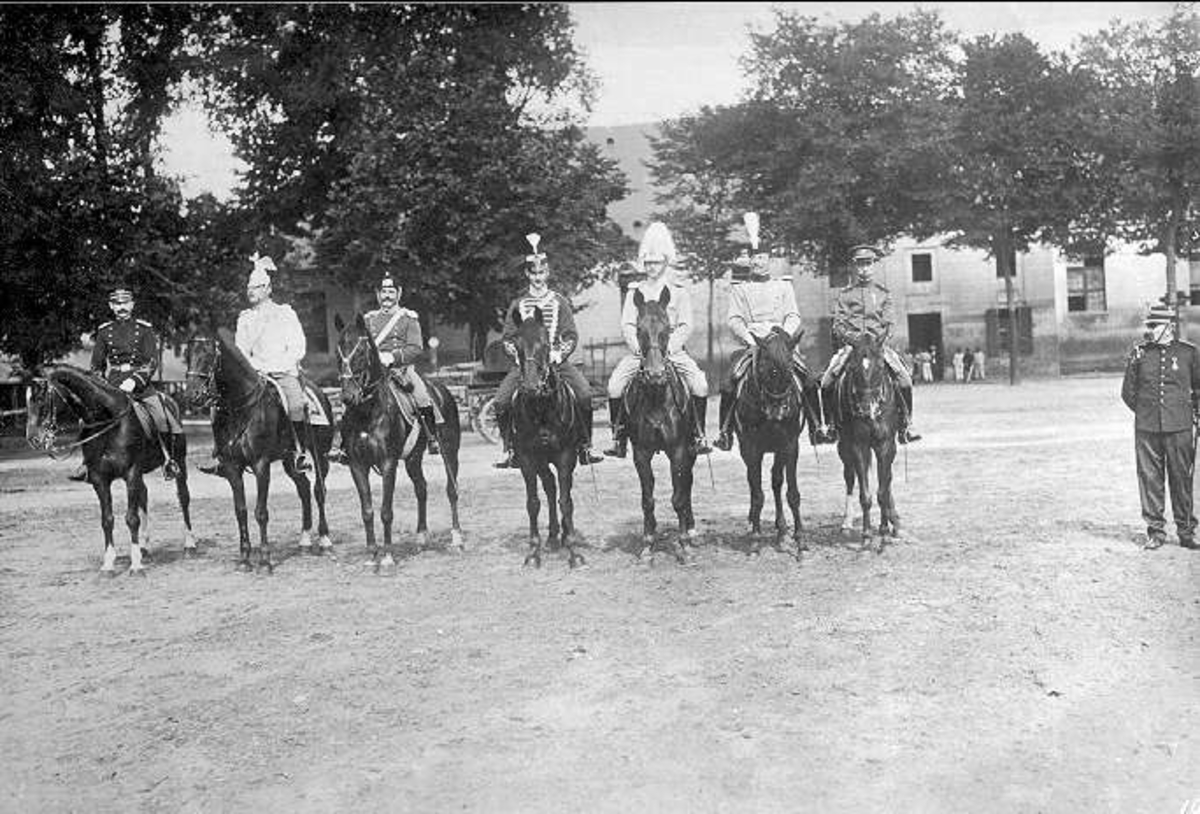 Livhusarer på resa och kommendering. Les officers étrangers. Capit. Short Ameri, capit Rodzanko Russe, capit Béron Bulg, Lieut, Cronstedt, Suéd, Lieut Lewenhaupt Suéd, Lieut Mostitch Serb, Soslieut. Dan pao Tchao. Chin.