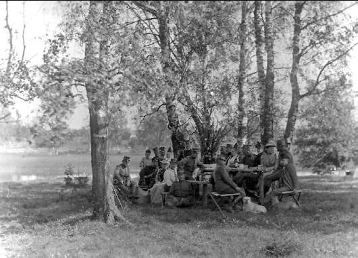 Gruppbild militärer och civila. Sommarmarsch till Tibro, förläggning för Ing 2 (bivack) 1893.