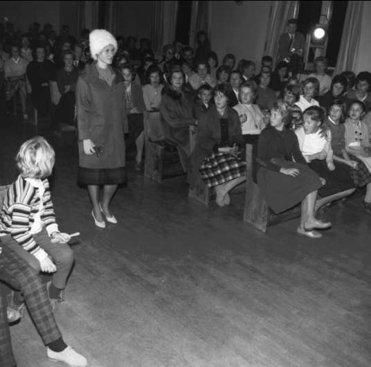 Karlsborg, mannekänguppvisning i Realskolans aula 1960. Endast neg finns.