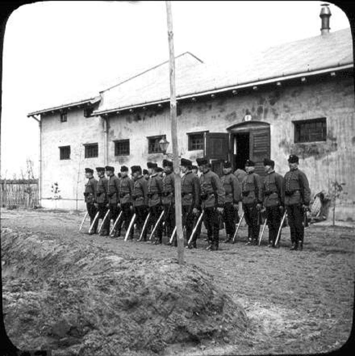 Pionärtrupper framför ett stall.
