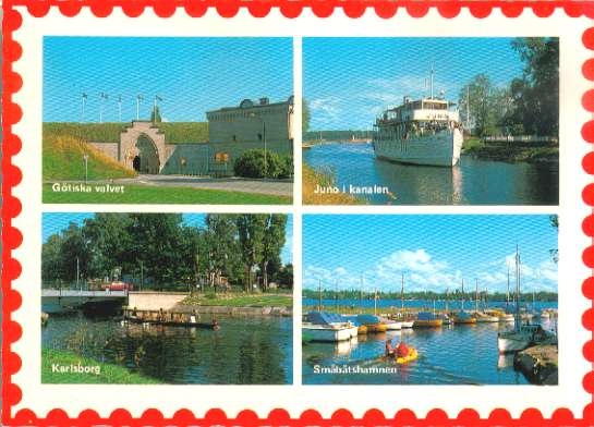 Vykort. Götiska valvet, Juno i kanalen, kanalbron, småbåtshamnen. Gåva av Karin Zeidlitz-Andersson.