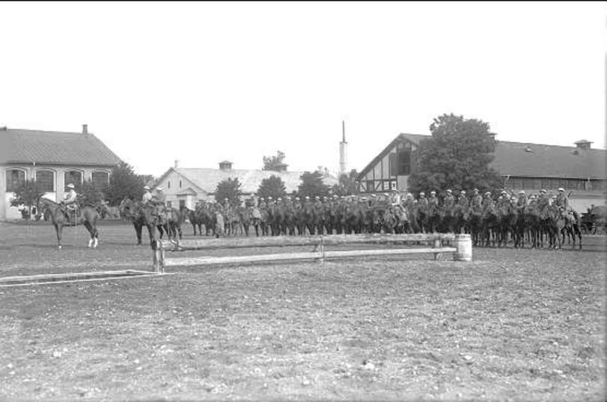 Livskvadron till häst uppställd på kaserngården söder om stallarna för avlämning före fälttjänstövning 1930. Avbildad trupp skall ingå i övningens B-styrka, de har vitt band runt hjälmen.