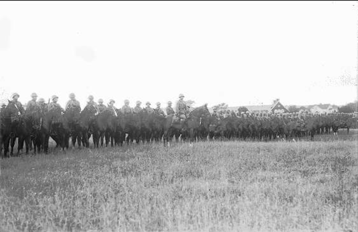 Regementet till häst uppställt på fältet söder om kasern för avlämning före avmarsch för samövning med J15 1934.