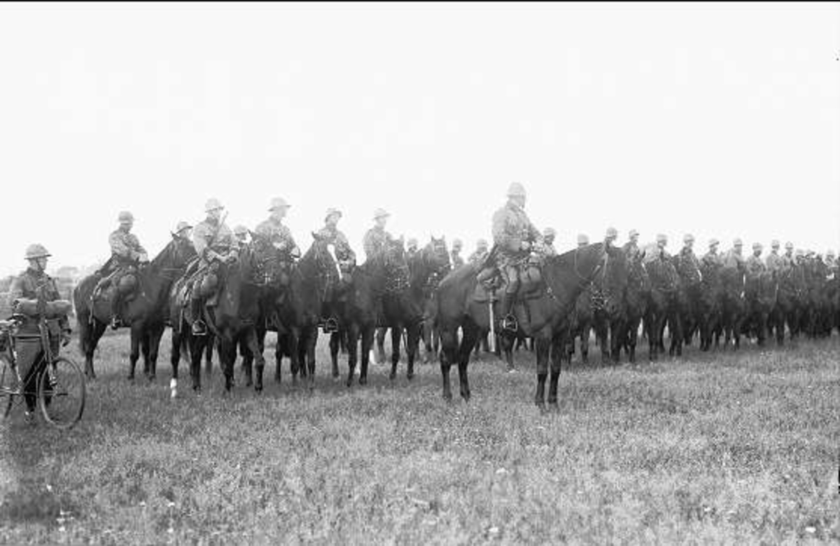 Regementet till häst uppställt på fältet söder om kasern för avlämning före sommarmarschens början 1934. Närmast kameran regementets pionjärgrupp.