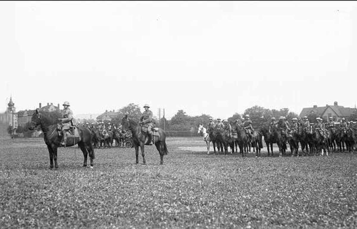 Regementet till häst uppställt på fältet söder om kasern för avlämning före sommarmarschens början 1929.