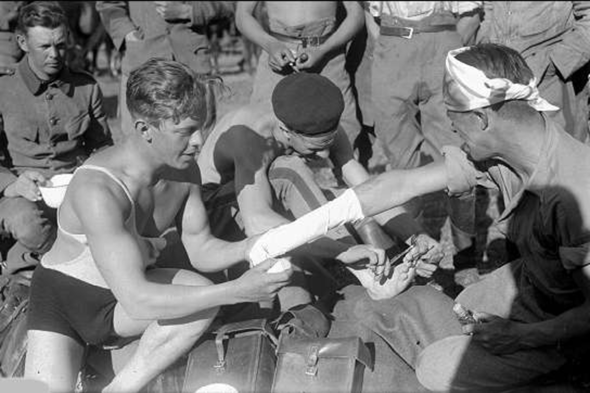 Lägerbild från Örlenlägret i Fagersanna under sommarmarschen 1934. Sjukvården i arbete efter dagens övningar.