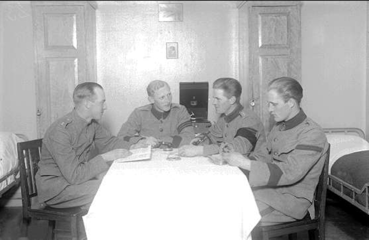 Ett furirrum fanns på varje skvadron, beläget närmast ingången på korridorens norra sida. Runt bordet bl.a. tresträckade furiren Erik Åkvist (nr 2 från höger) sedemera fanjunkare K 3. Mycket duktig remontdressör och tresträckade furiren Sven Mattson sedemera fanjunkare K 3 (nr 2 från vänster).