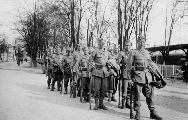 Beredskap i Torsby 1940 - 1941. Ute på marsch. Kortet finns ej på museet, utan tillhör Allan Mikaelsson, Tranås.