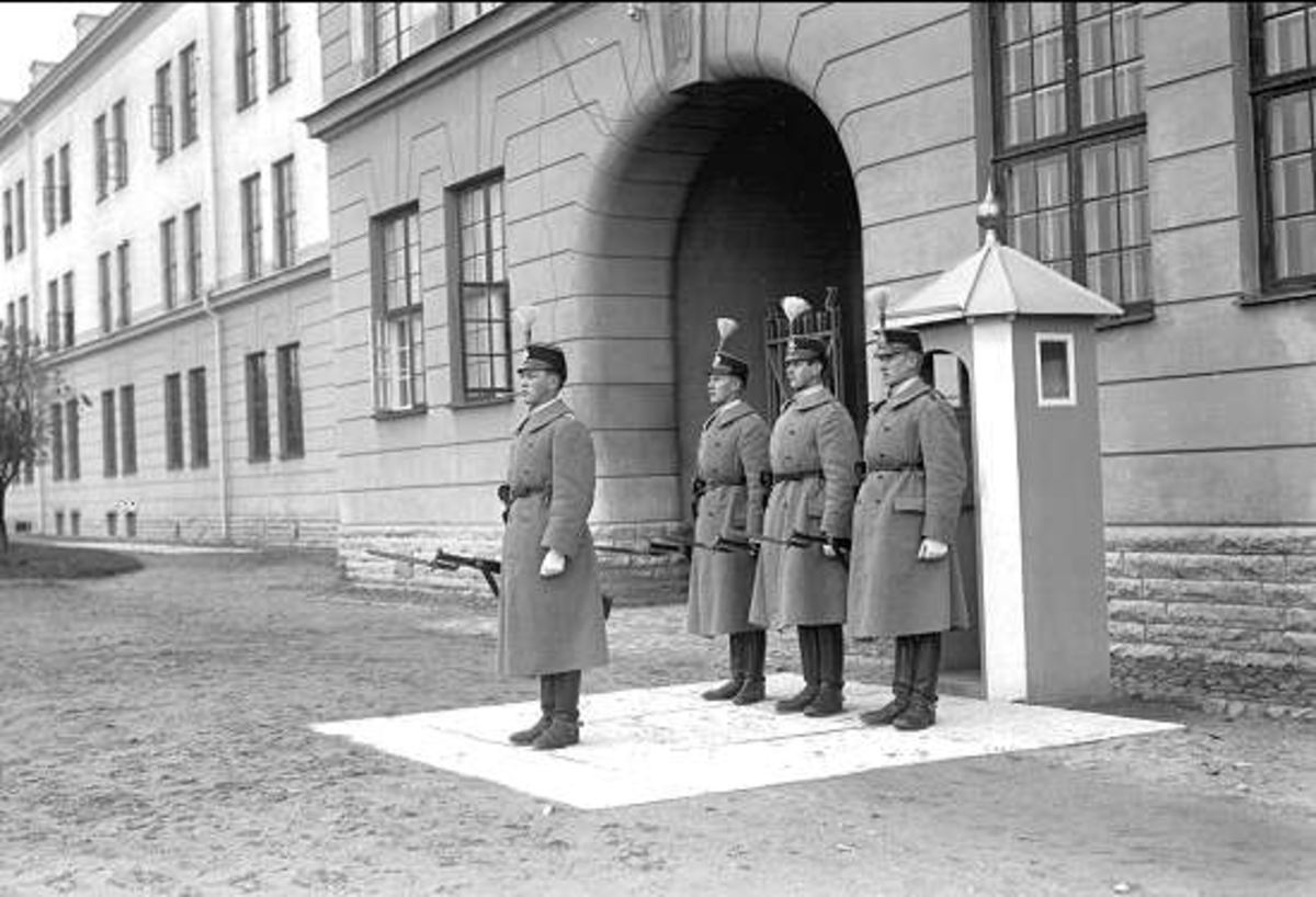 Kasernvakten uppställd för avlämning utanför valvet på K 3 kasern. Klädsel: parad (plym och vita handskar).