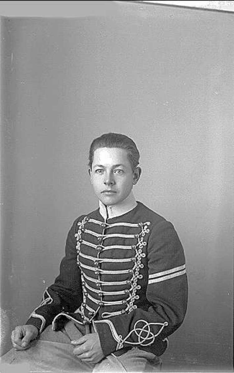 Livhusar i dolma m/1895 (m/ä). Två streck på vänster ärm visar genomgången och godkänd furirskola. Galonen på kragens övre kant visar att livhusaren har furirs grad.