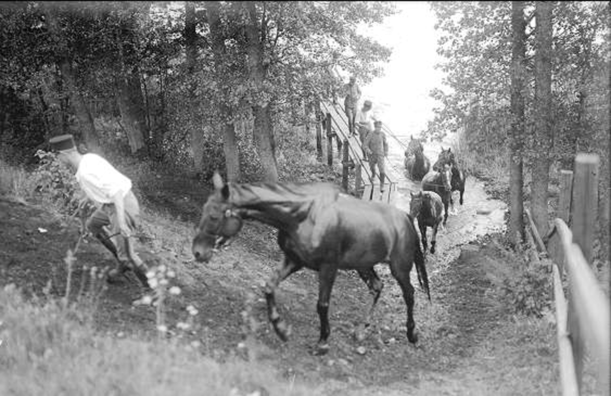 Svämning av hästar vid bryggan i Sjötorpssjön. På väg upp ur badet.