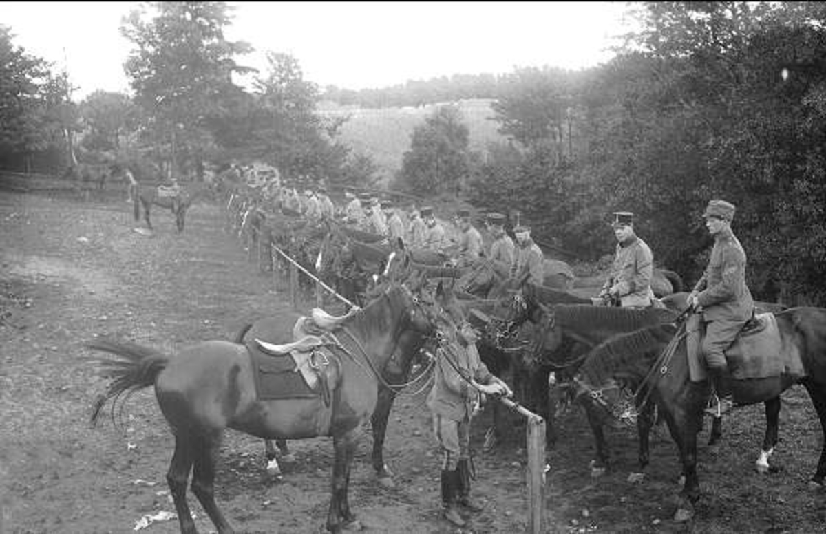 Uppsittning för hemmarsch efter svämning i Sjötorpssjön. Truppen klädd i uniform m/1910. Furiren längst till höger klädd i uniform m/1923. Längst fram till vänster officerens häst med bladsadel och blå vojlock.