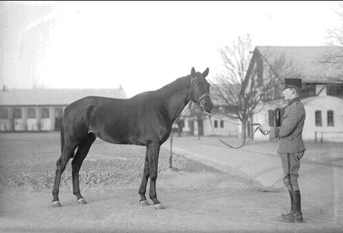 Livhusar (hästskötare) med officers tjänstehäst söder om skvadronstallarna.