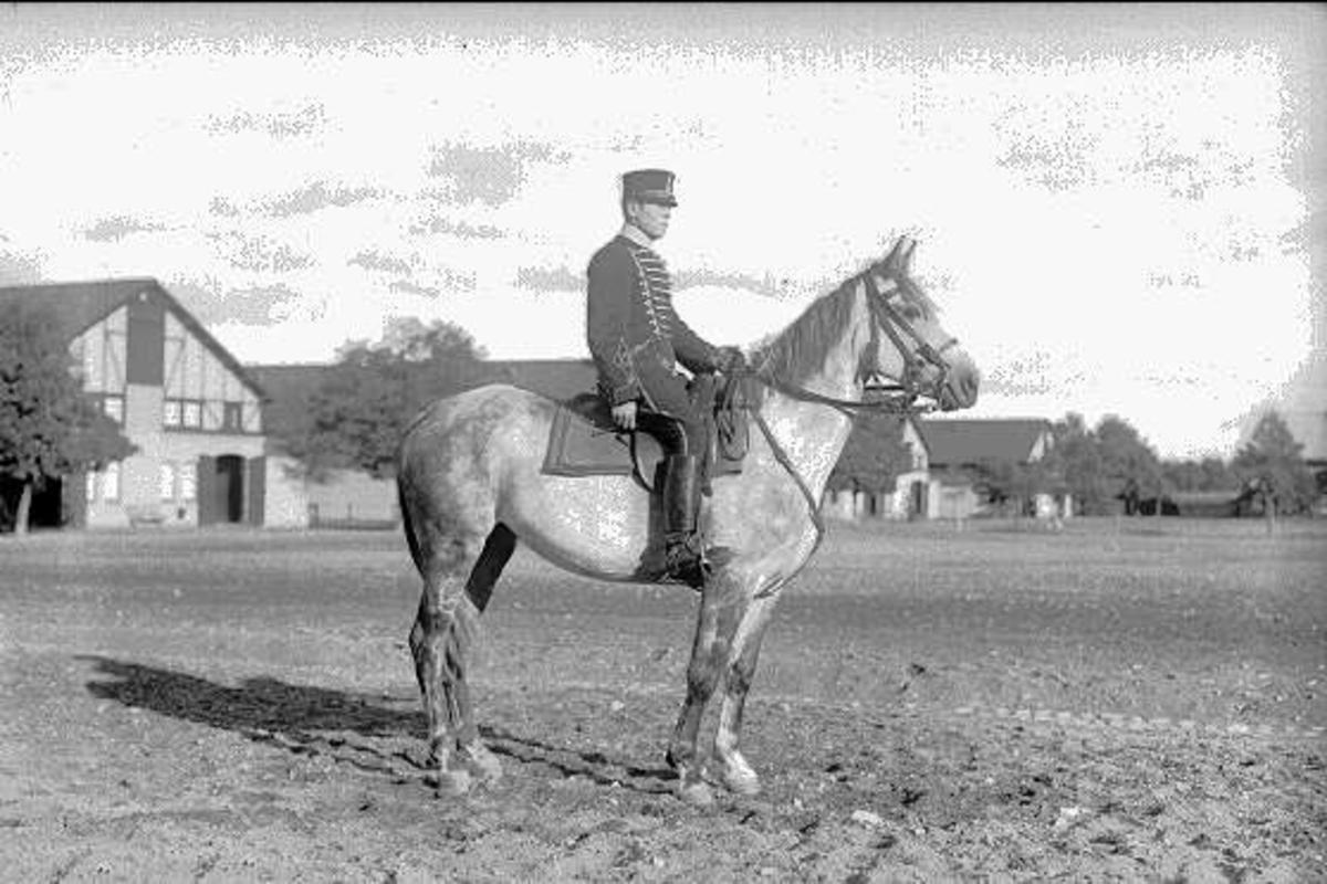 Titel: Livhusar med tilldelad stamhäst framför skvadronens stall.