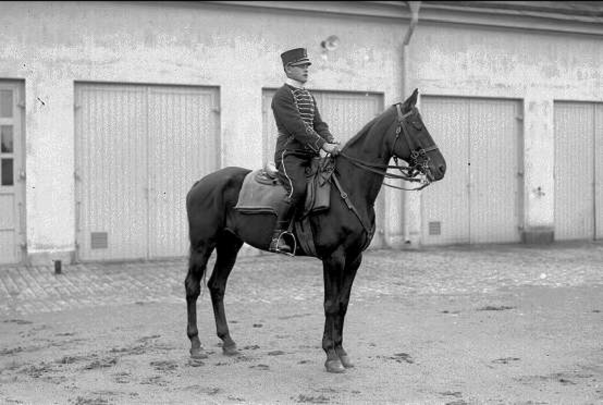 Titel: Livhusar med tilldelad häst utanför garaget