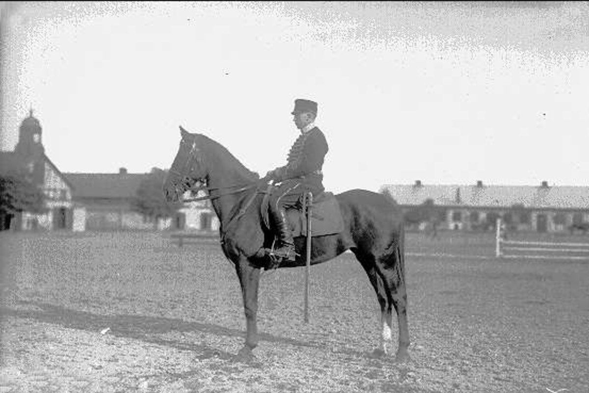 Livhusar med tilldelad häst på kaserngården, i bakgrunden ridhuset