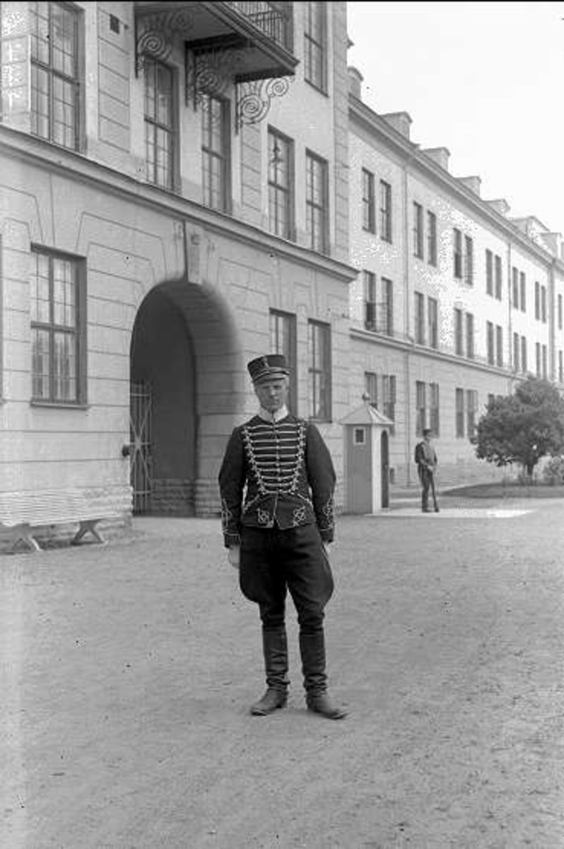 Livhusar i uniform m/1895 utanför södra valvet, K 3 kasern i Skövde