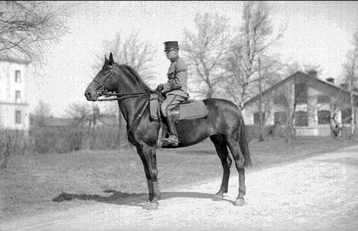 Livhusar med tilldelad stamhäst öster om kasernbyggnaden. TIll höger ridhusets södra gavel.