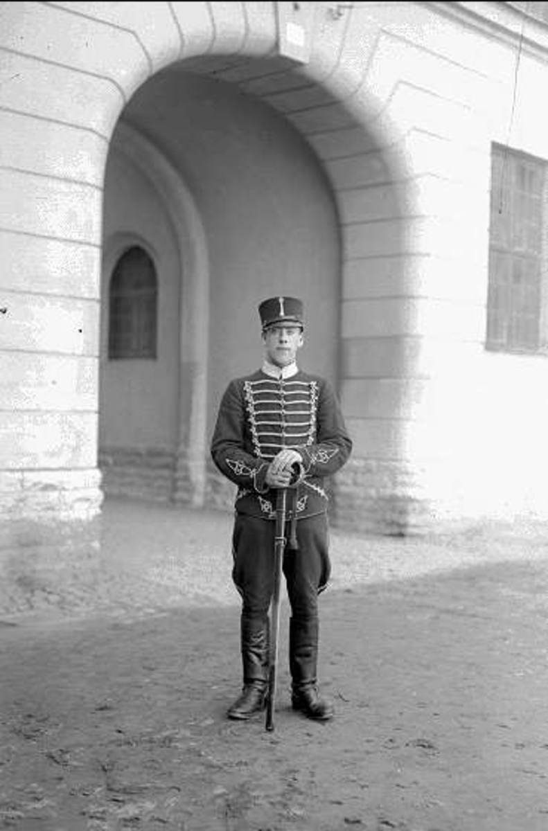 Titel: Livhusar i uniform m/1895 (m/ä) utanför norra valvet på K 3 kasern i Skövde