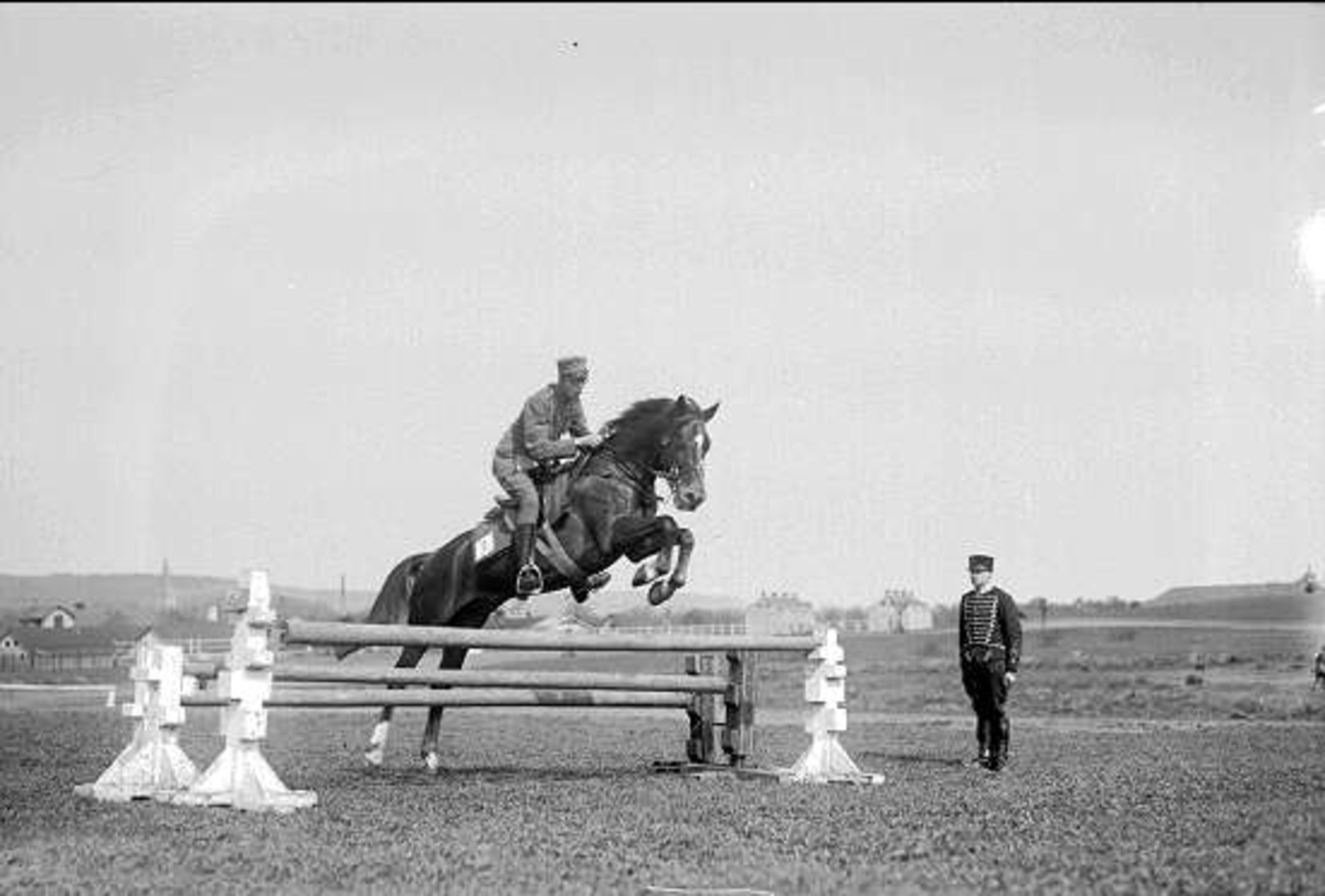 Hoppträning på fältet öster om kasern ("lusharpan"). S.skvadronens stall skymtar i bakgrunden.