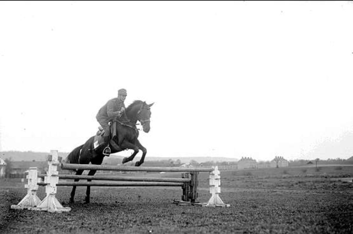 Hoppträning på fältet öster om kasern. Nordöstra hörnet av ridhuset syns i bildens vänstra hörn.