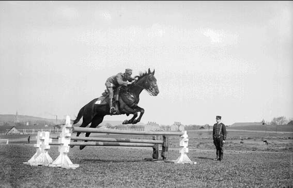 Hoppträning på fältet öster om kasern ("lusharpan"). 5.skvadronens stall skymtar i bakgrunden.