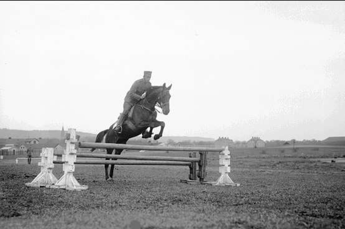 Hoppträning på fältet öster om kasern ("lusharpan"). 5.skvadronens stall skymtar i bakgrunden.