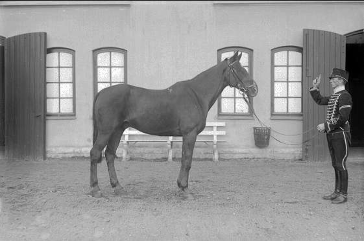 Livhusar med tilldelad stamhäst ur 2.skvadron framför skvadronens stall.
