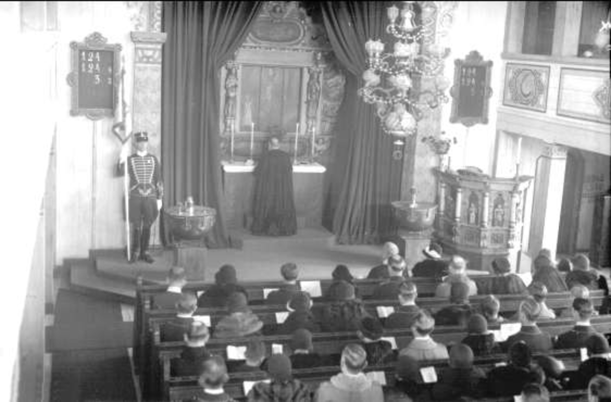 Högtidlighållandet den 4:de dec. för minnet av slaget vid Lund 1676 i soldathemmet. Vid altaret pastor Paulinus Nilsson och löjtnant Claes von Essen som standarförare.