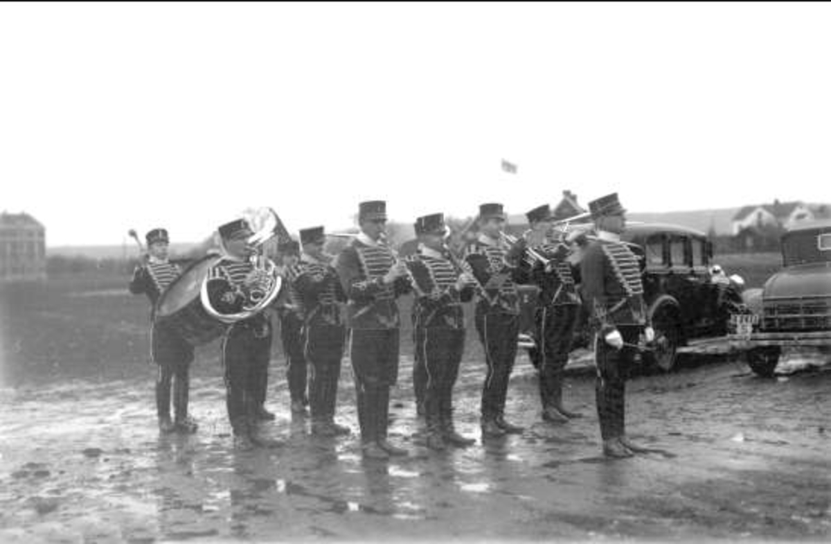 Högtidlighetshållandet av 4 december. Delar av K 3 musikkår mitt emot valvet under förbimarschen efter högtidligheterna i soldathemmet. Musikfanjunkare G .Borgman, iförsta ledet från vänster musiksergeant Lindblad.