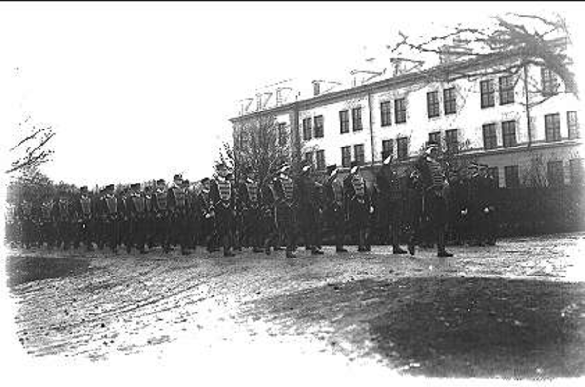 4.skvadrons förbimarsch efter 4.dec högtidlighet i soldathemmet. Framför skvadronen ryttm Rolf Örn och fanjunkare C-G Sjöblom (skvadronsadjutant). Löjtn. Folke Linton, löjtnant Hakon Gissle ( i K2-uniform), serg S. Seipel och serg E. Tiberg.