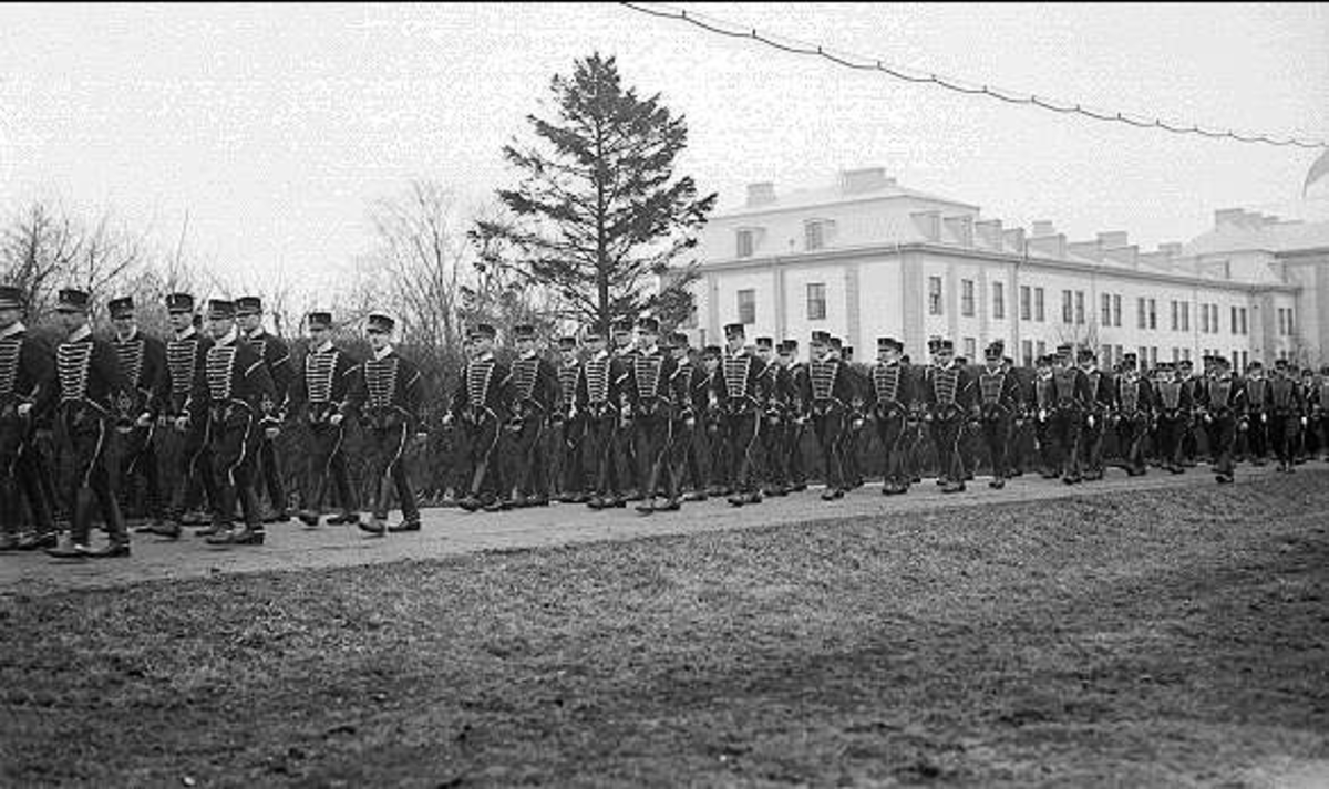 Marsch till soldathemmet för högtidlighållandet av 4 december. Täten 4.skvadron. Vid signalavd. löjtnant G F Burman.