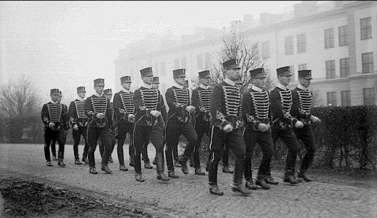 Förbimarsch söder valvet K 3 kasern efter 4. decemberhögtidlighet i soldathemmet.