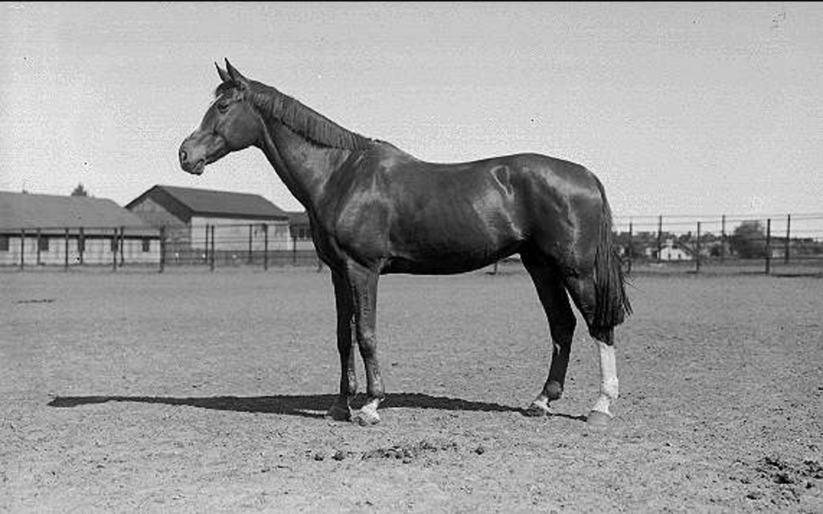 Stamhäst utanför järnpaddocken öster K 3 ridhus.