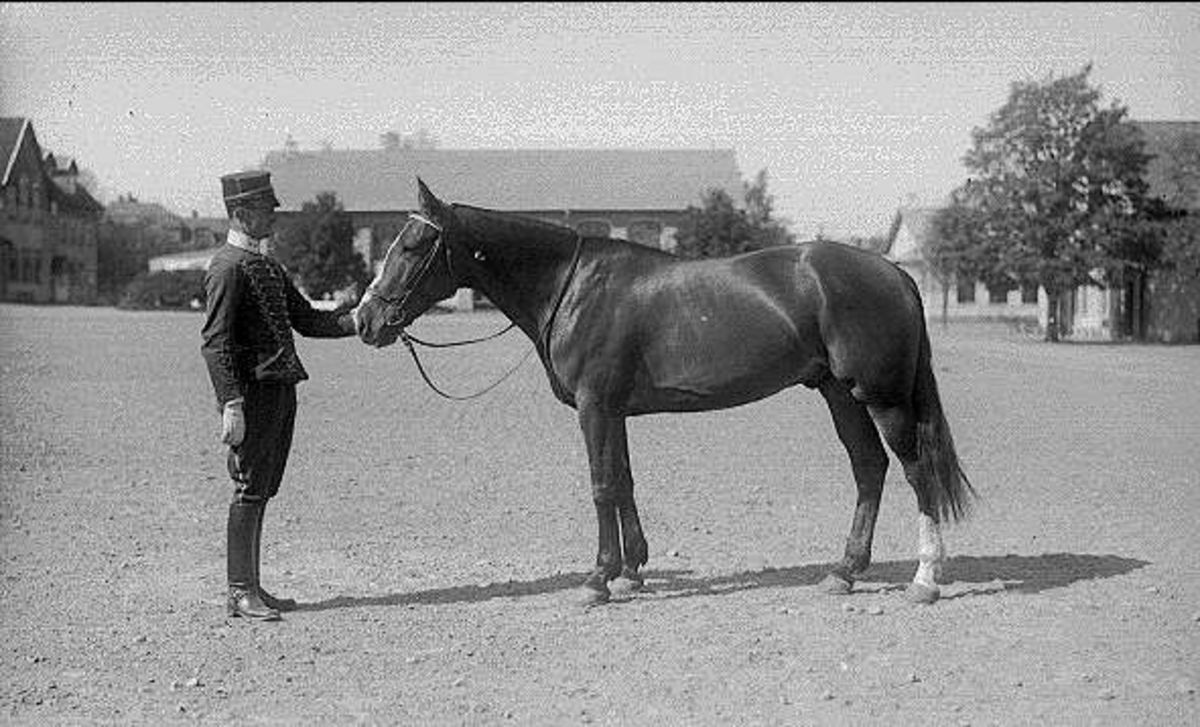 Löjtnant på K 3 med tjänstehäst på kaserngården söder om skvadronens stall.