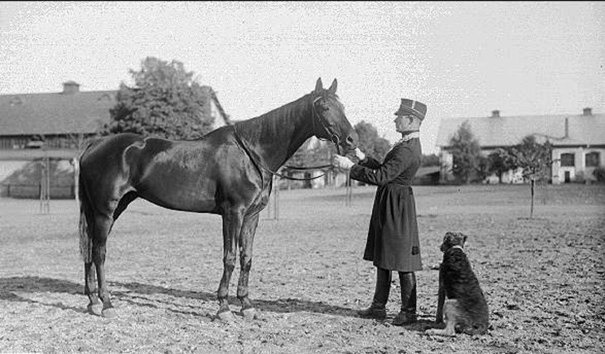 Officer i bigesch med tjänstehäst på kaserngården söder om skvadronstallarna. Dagofficersbricka med blått band runt kragen.